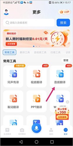 1. 用户在进入应用的【更多】页面后,点击【音频翻译】。